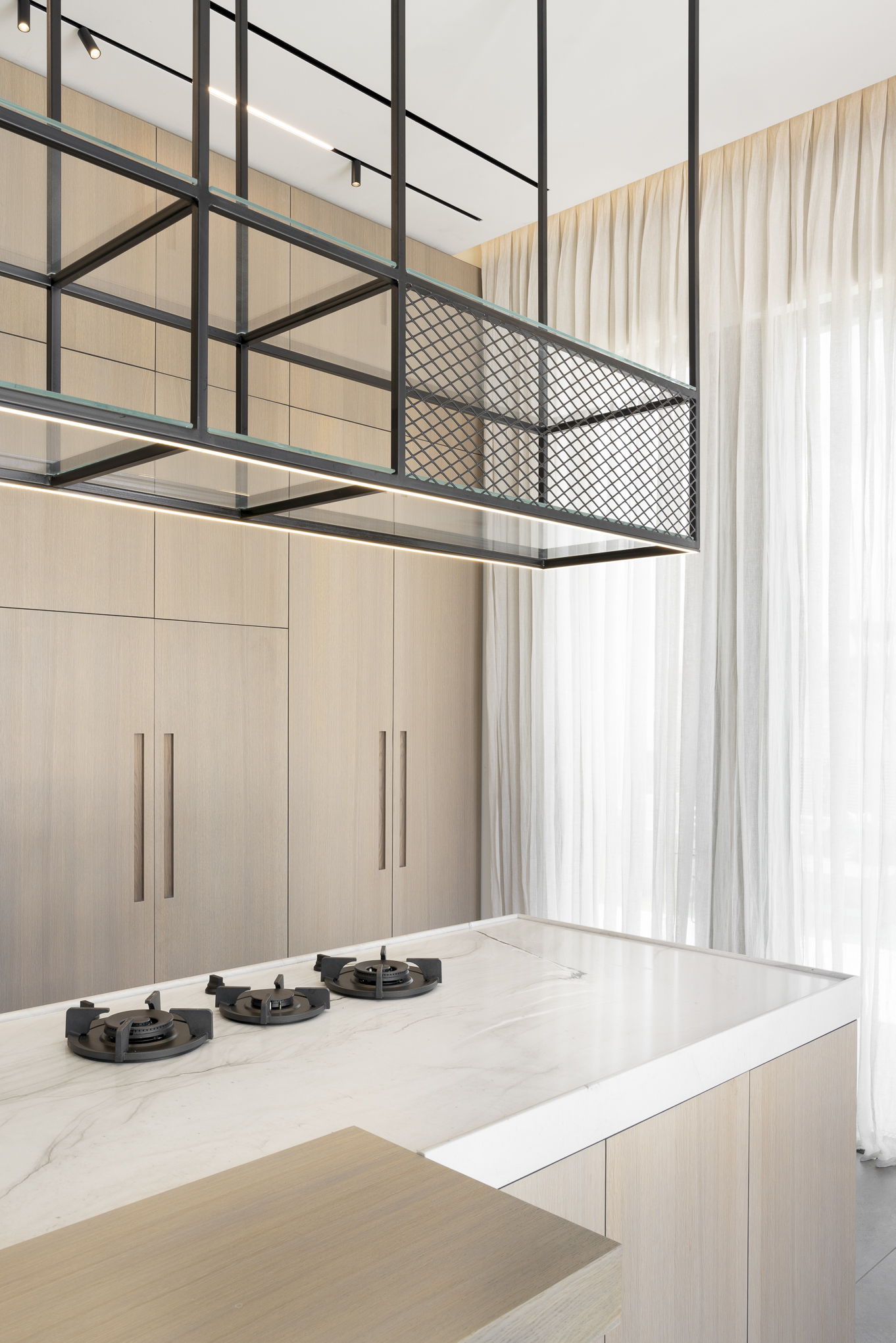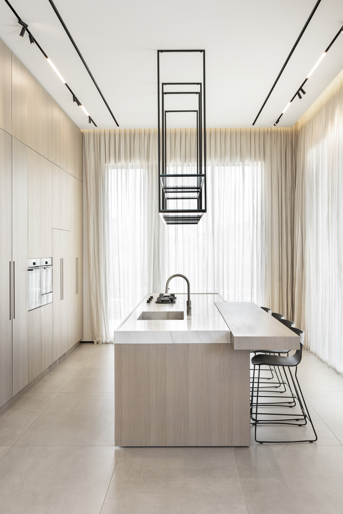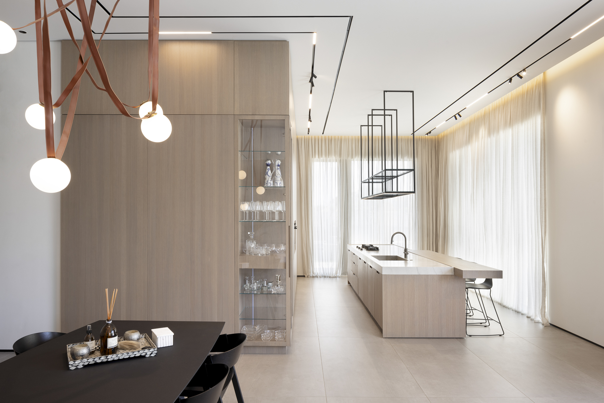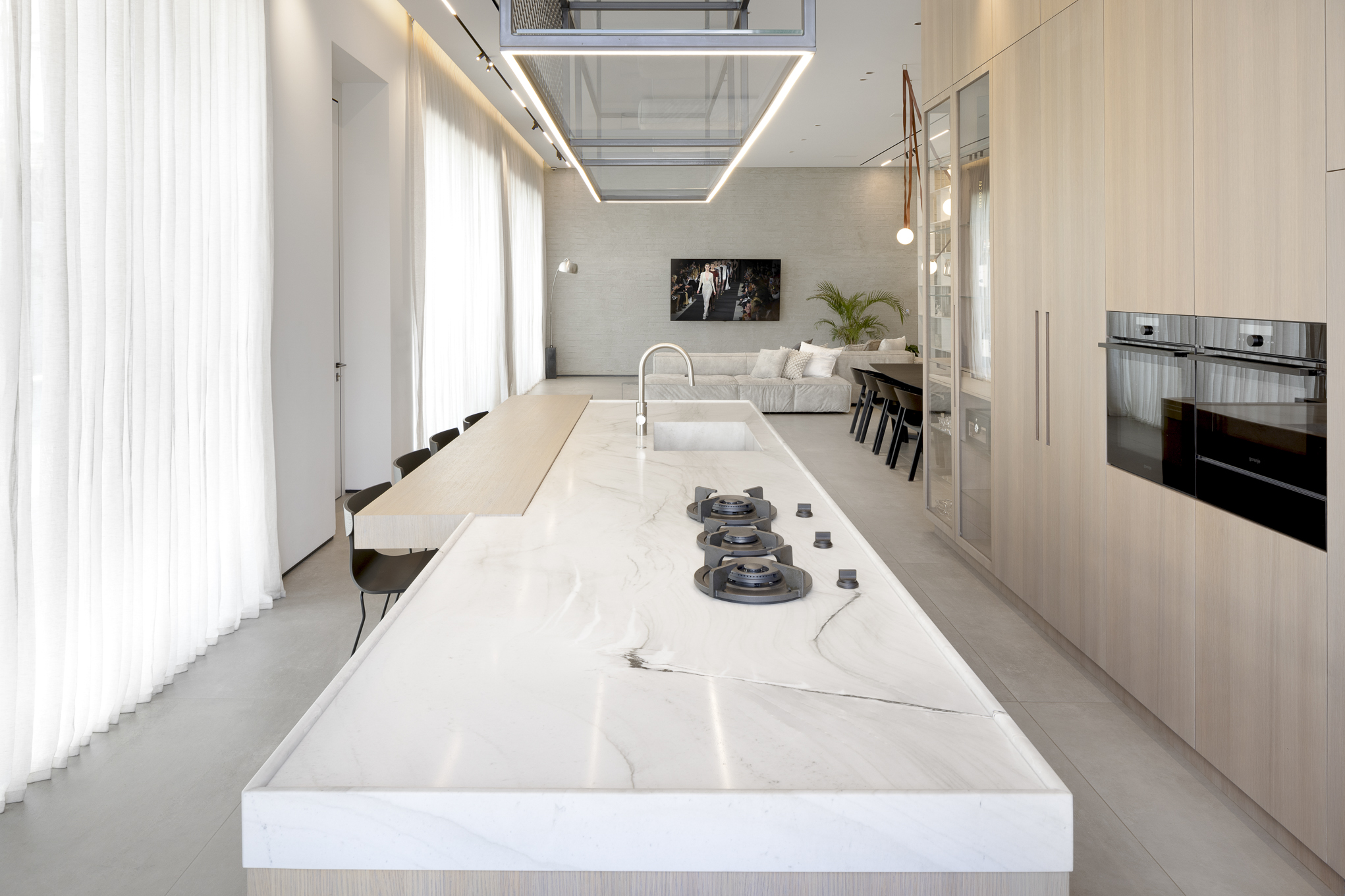 המטבח תוכנן בקפידה עם קיר כח מרכזי מעץ אלון מעושן , העץ ממשיך כחיפוי לפינת האוכל והקירות המתמשקים עם המטבח , וחוזר גם באזור המבואה לשירותי האורחים.
