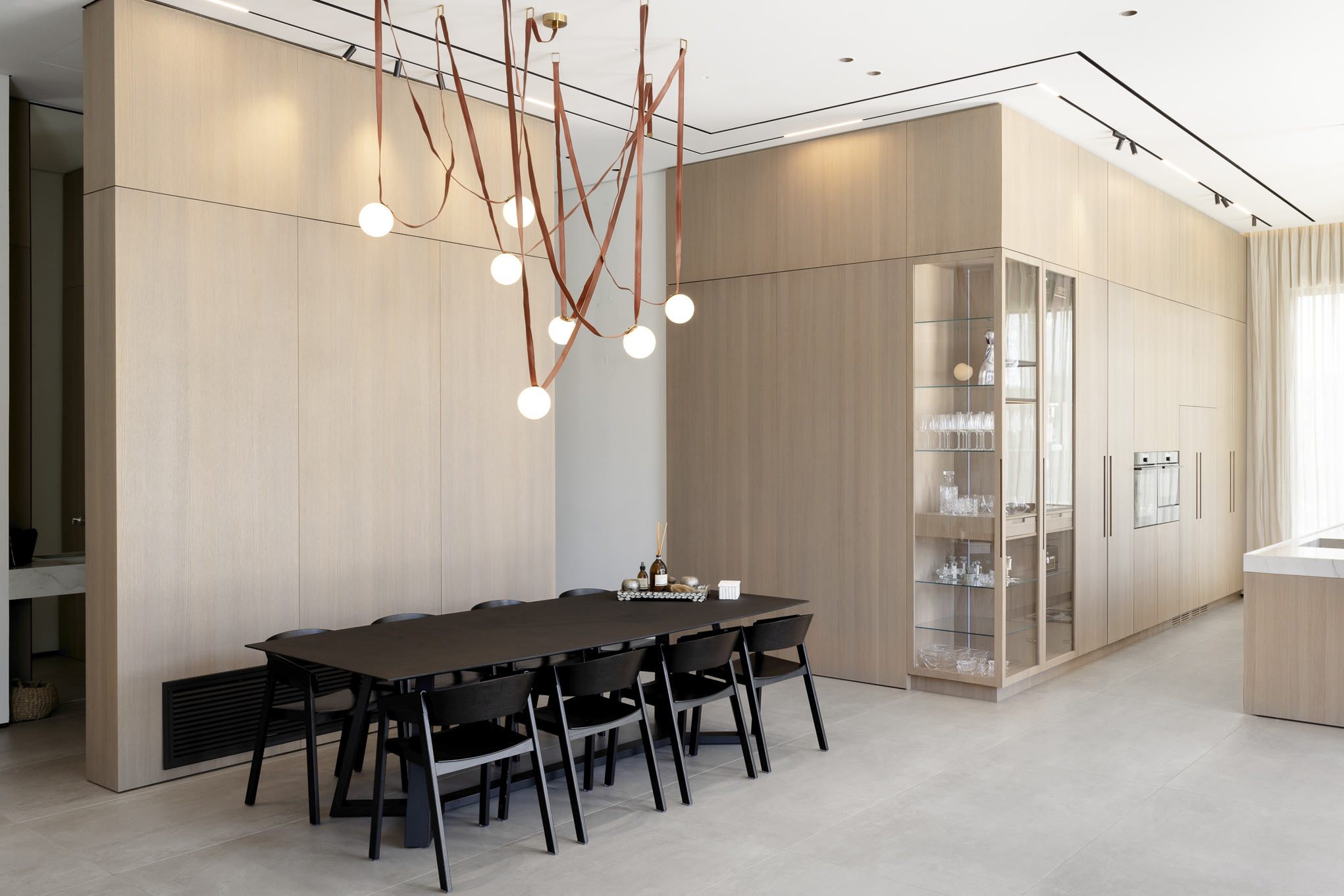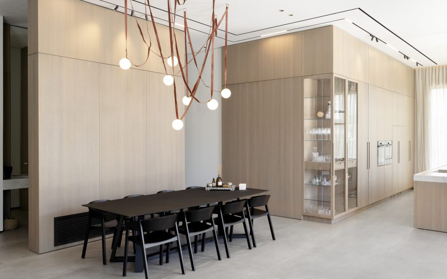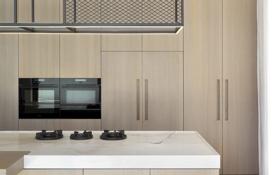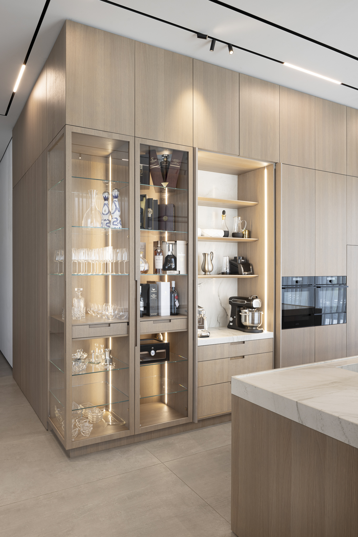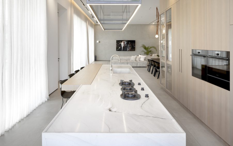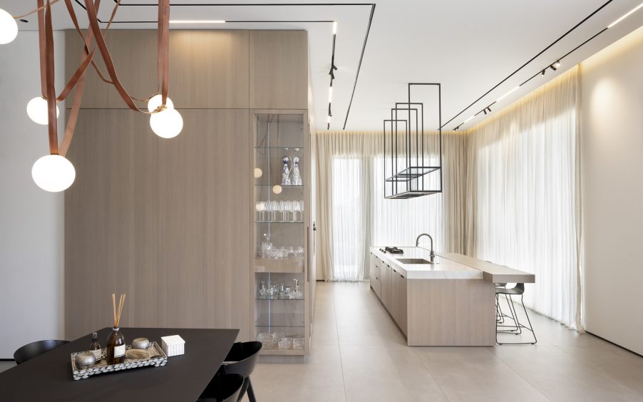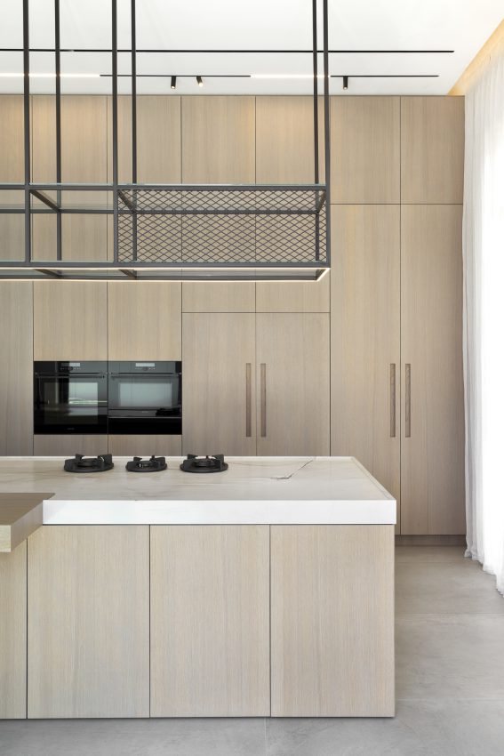 המטבח תוכנן בקפידה עם קיר כח מרכזי מעץ אלון מעושן , העץ ממשיך כחיפוי לפינת האוכל והקירות המתמשקים עם המטבח , וחוזר גם באזור המבואה לשירותי האורחים.