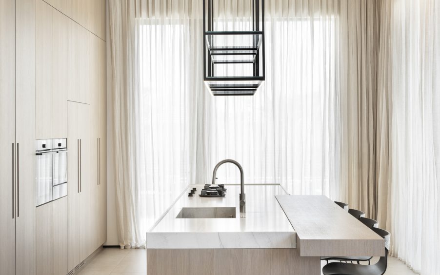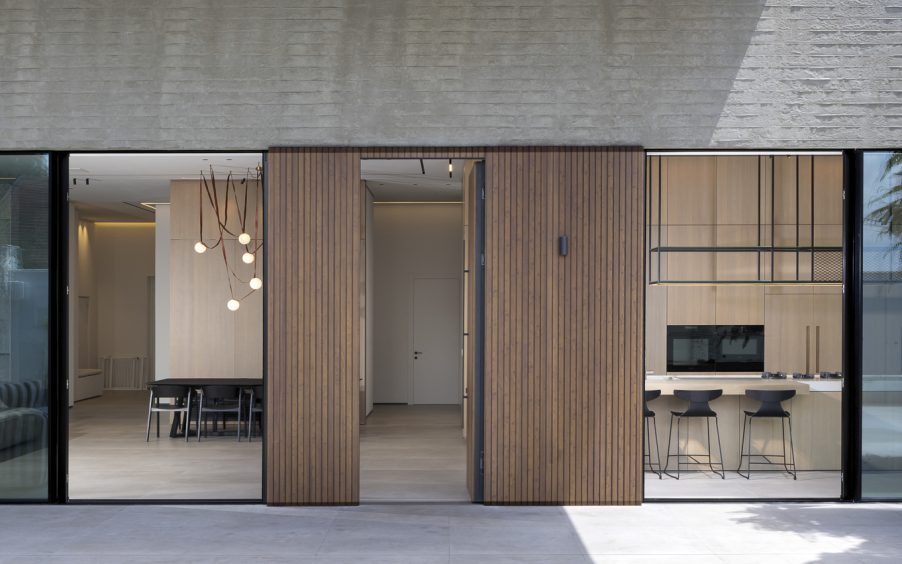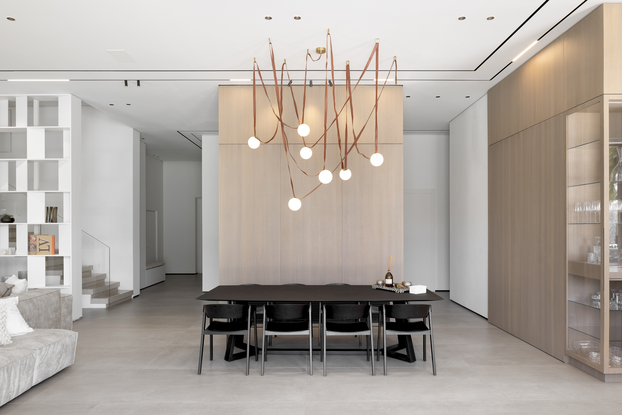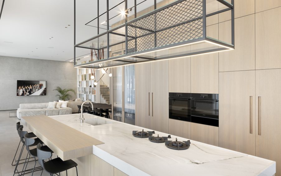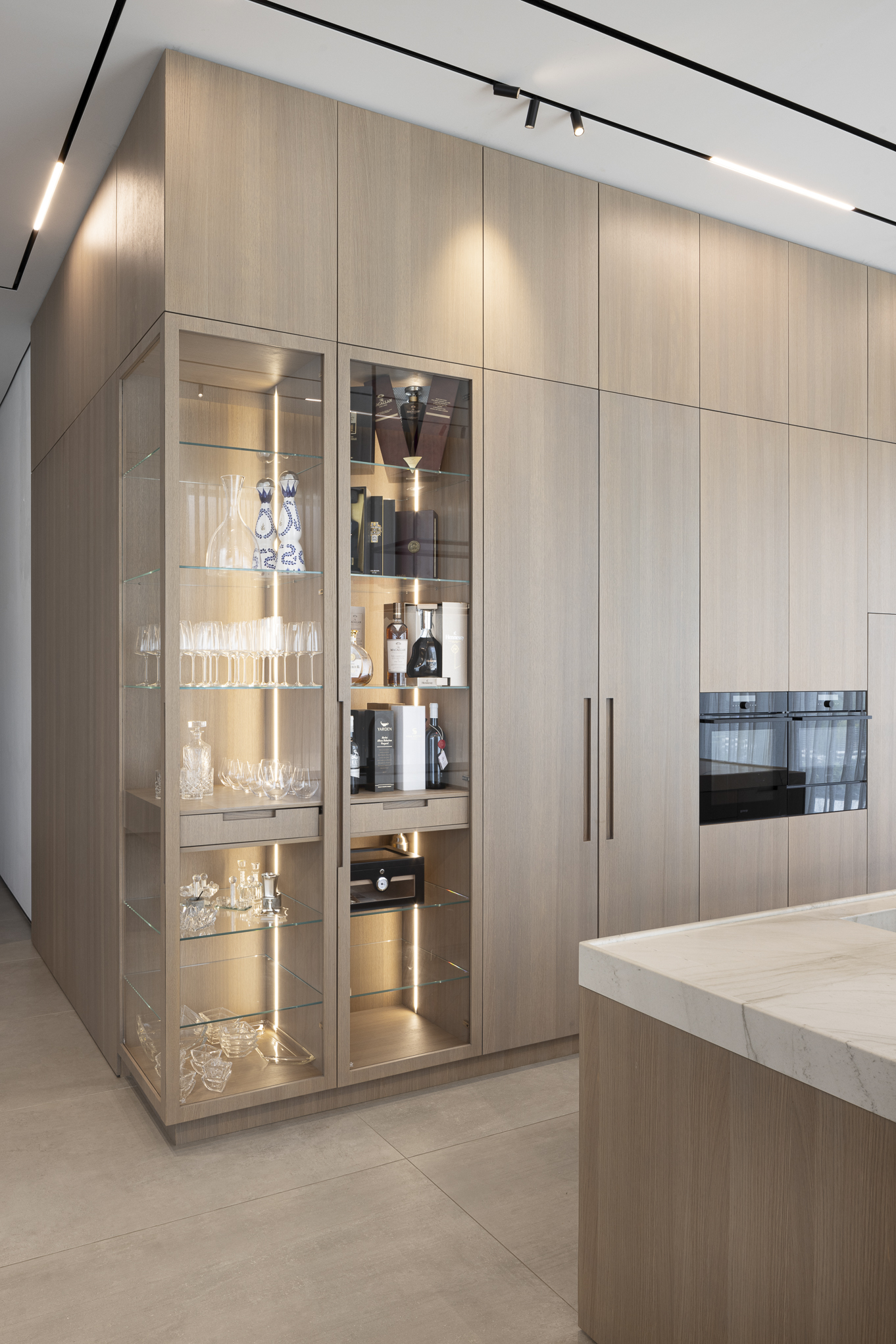 המטבח תוכנן בקפידה עם קיר כח מרכזי מעץ אלון מעושן , העץ ממשיך כחיפוי לפינת האוכל והקירות המתמשקים עם המטבח , וחוזר גם באזור המבואה לשירותי האורחים.
