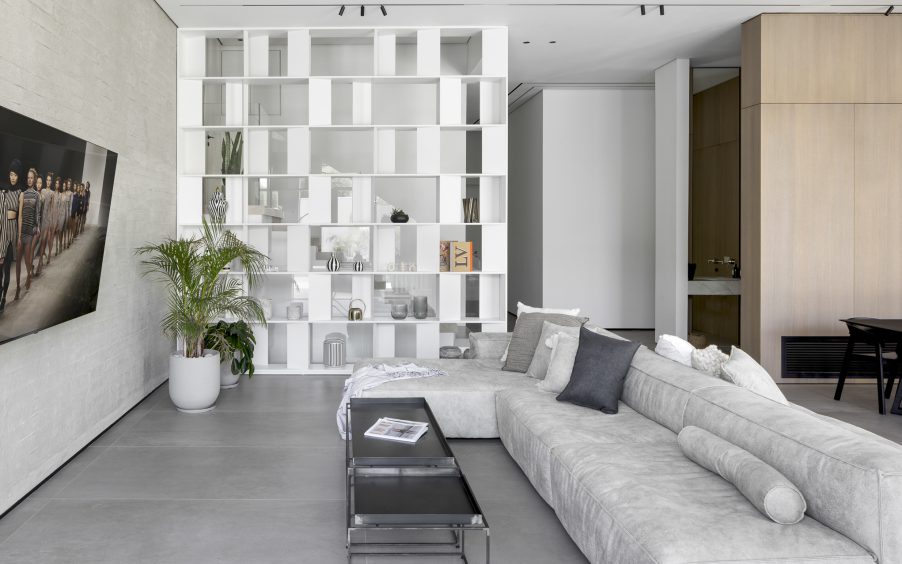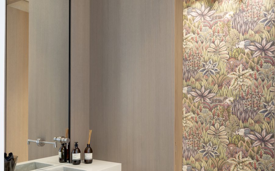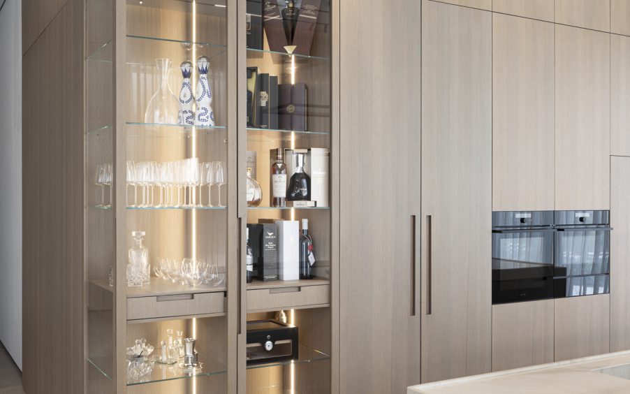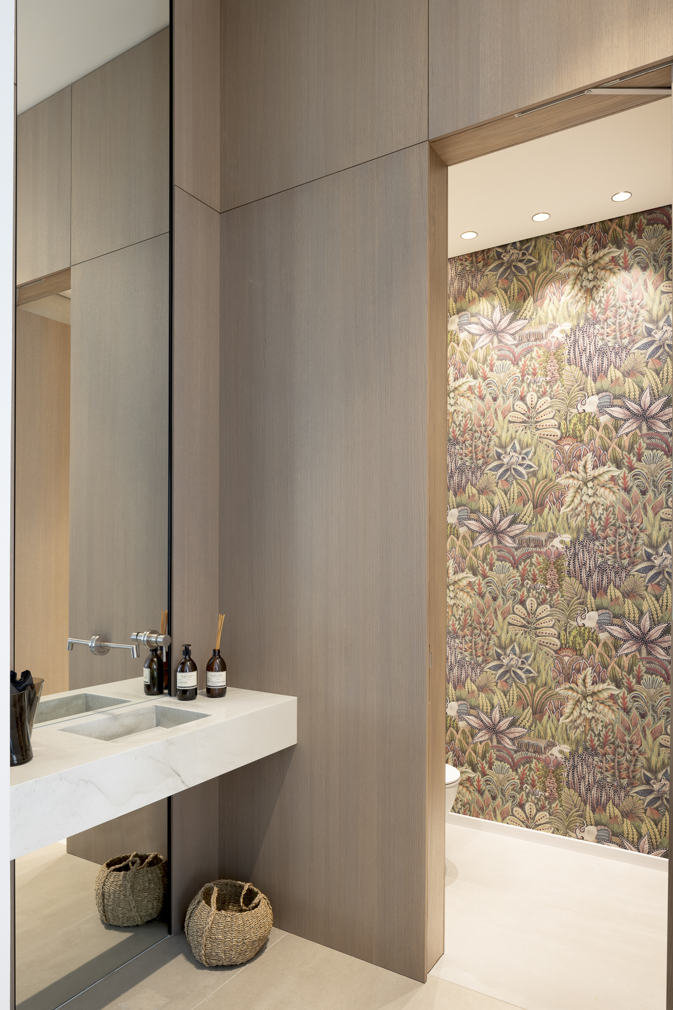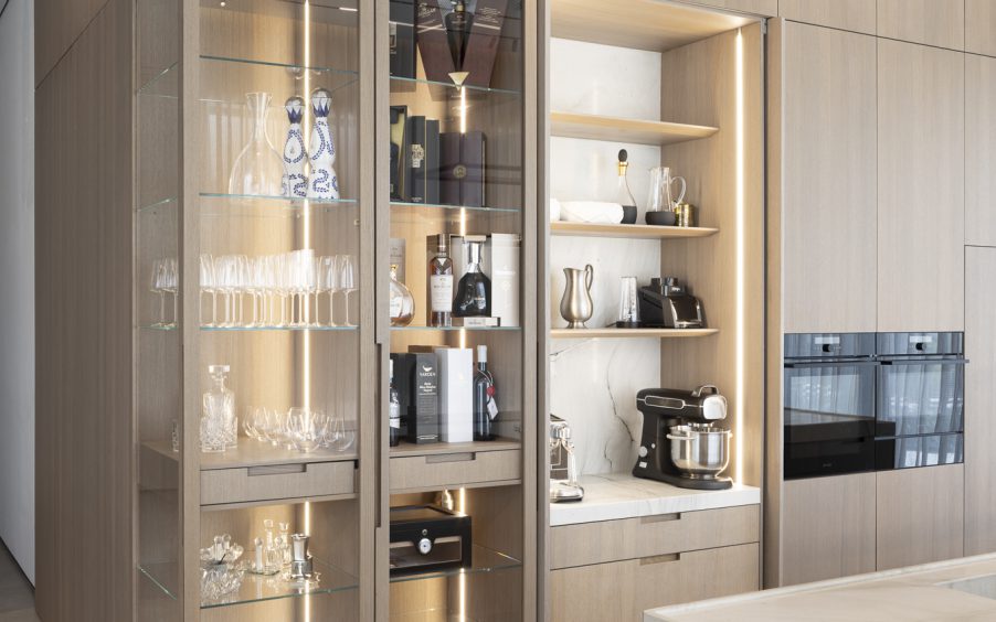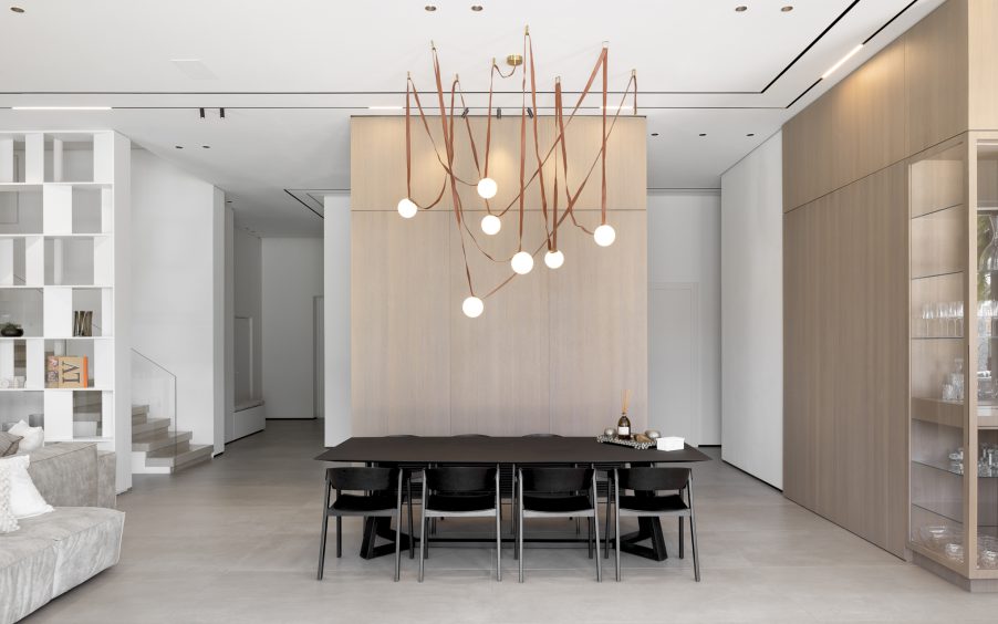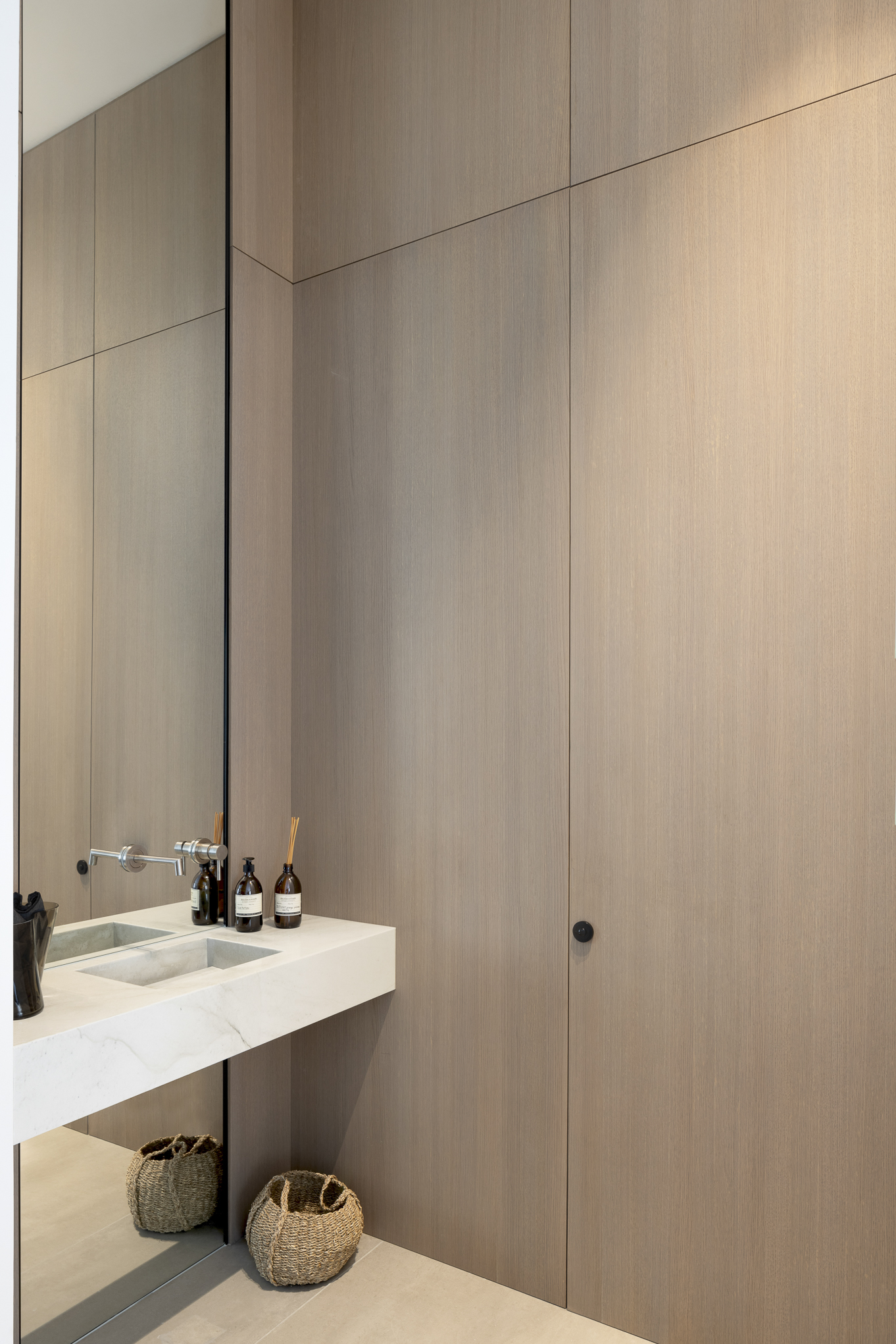 המטבח תוכנן בקפידה עם קיר כח מרכזי מעץ אלון מעושן , העץ ממשיך כחיפוי לפינת האוכל והקירות המתמשקים עם המטבח , וחוזר גם באזור המבואה לשירותי האורחים.