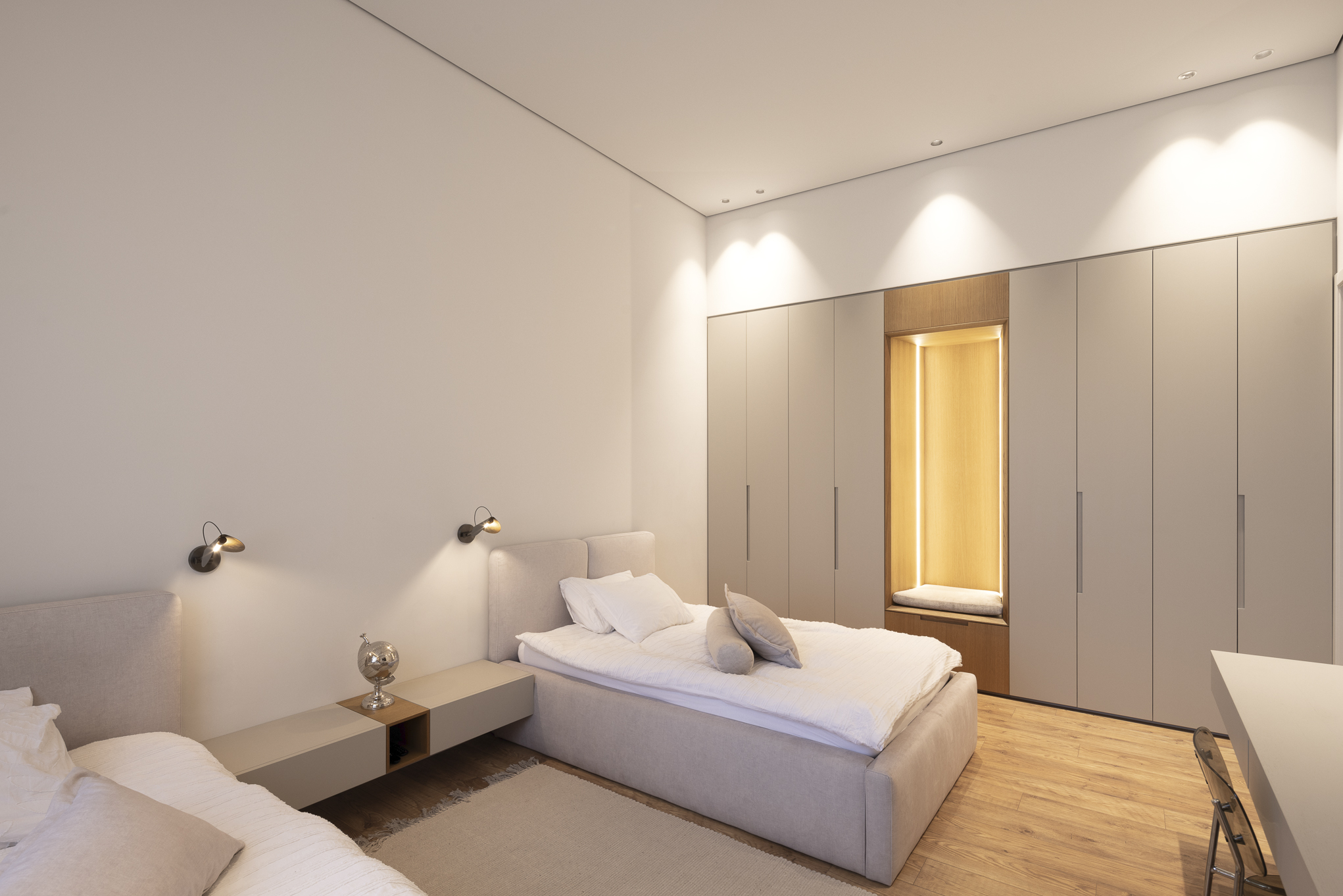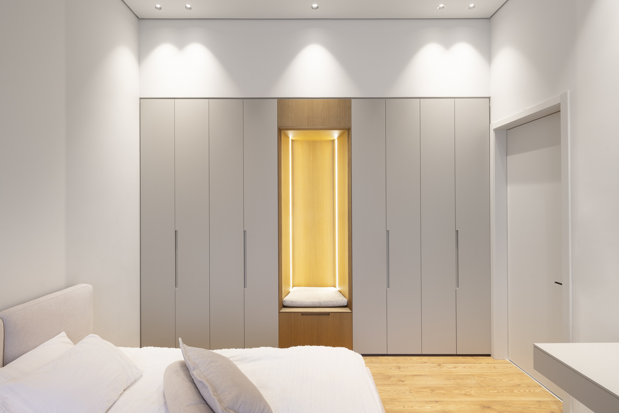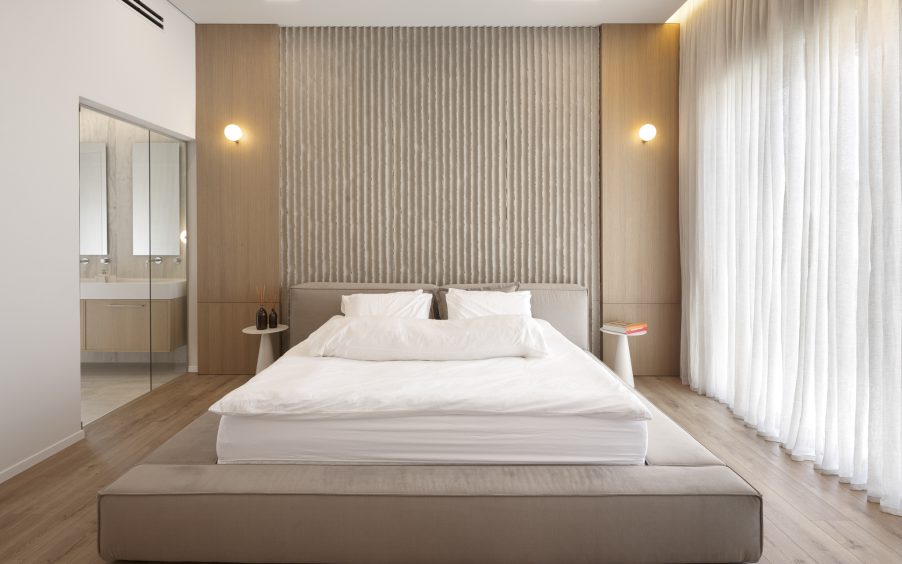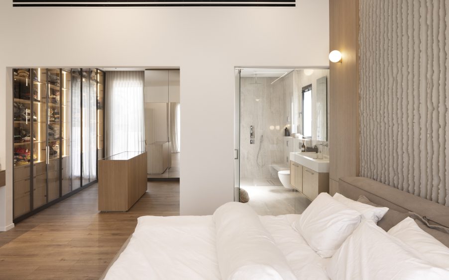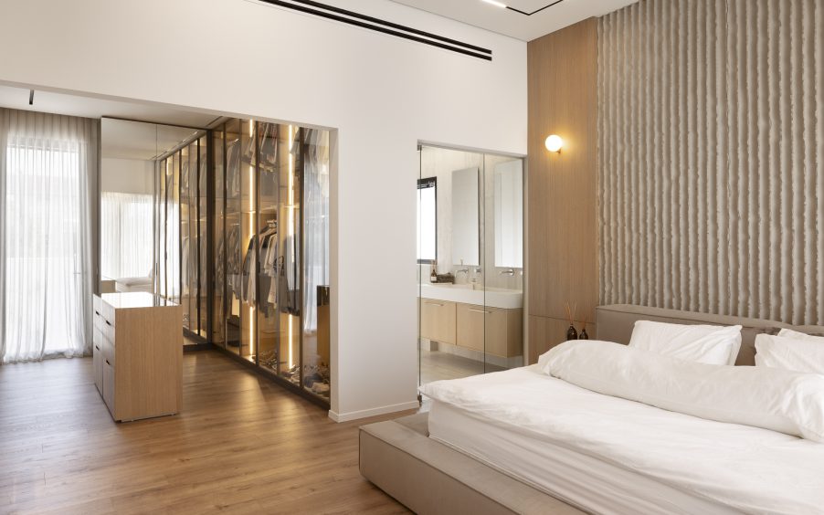 בחדר מאסטר הורים מספר פרטי נגרות העוטפים את החדר ומשדרים תחושת רוגע ואינטימיות , גם שם חוזר העץ על קיר ראש המיטה בשילוב אבן פראית , בפינת האיפור ובחדר הארונות , חדר הארונות בשילוב דלתות אלומיניום וזכוכית שקופה מאפשרים גישה נוחה לביגוד , במרכז אי עם מקום לתכשיטים שעונים וכו…