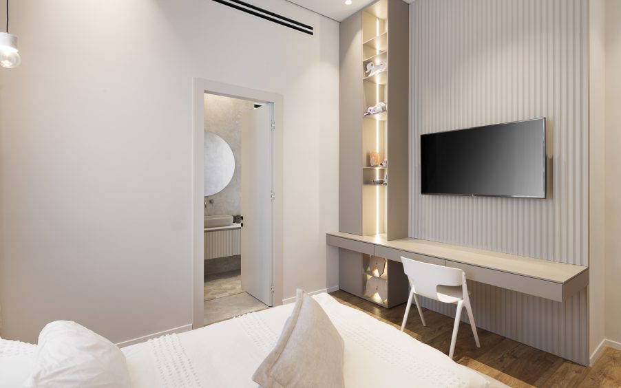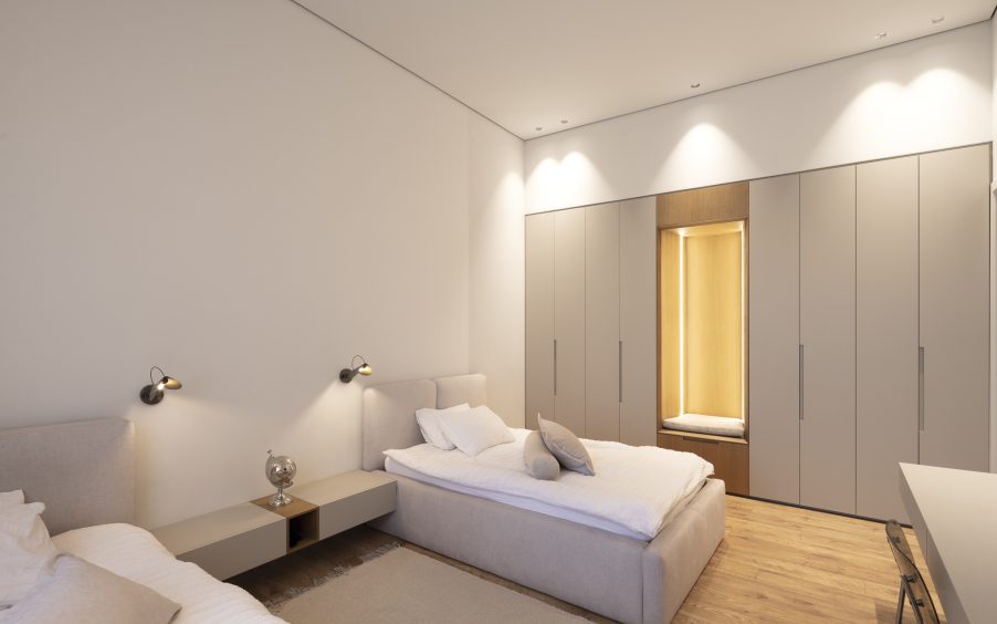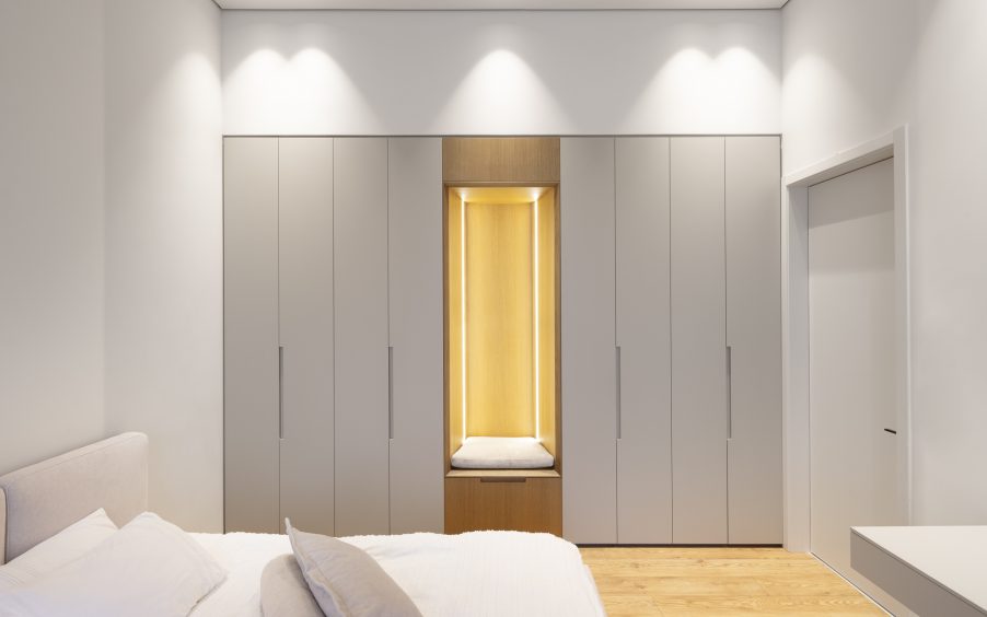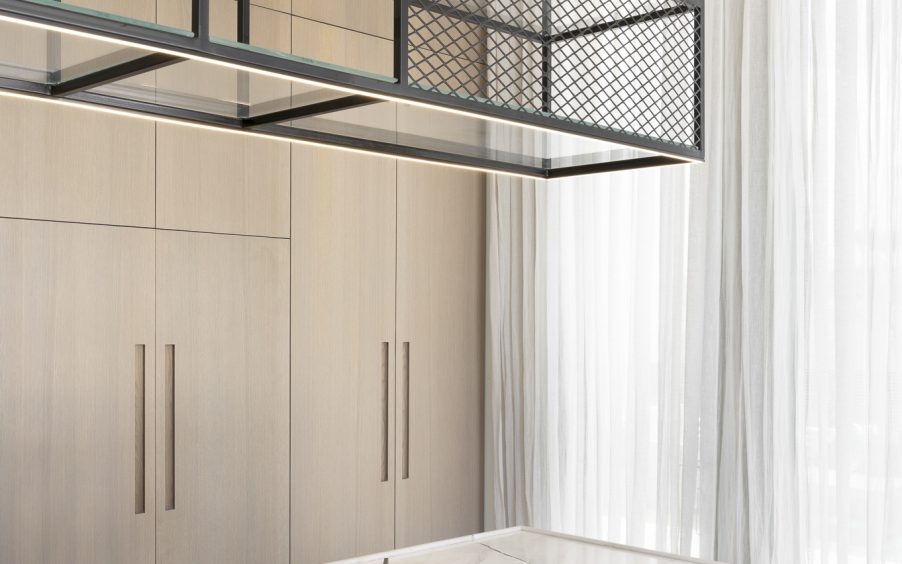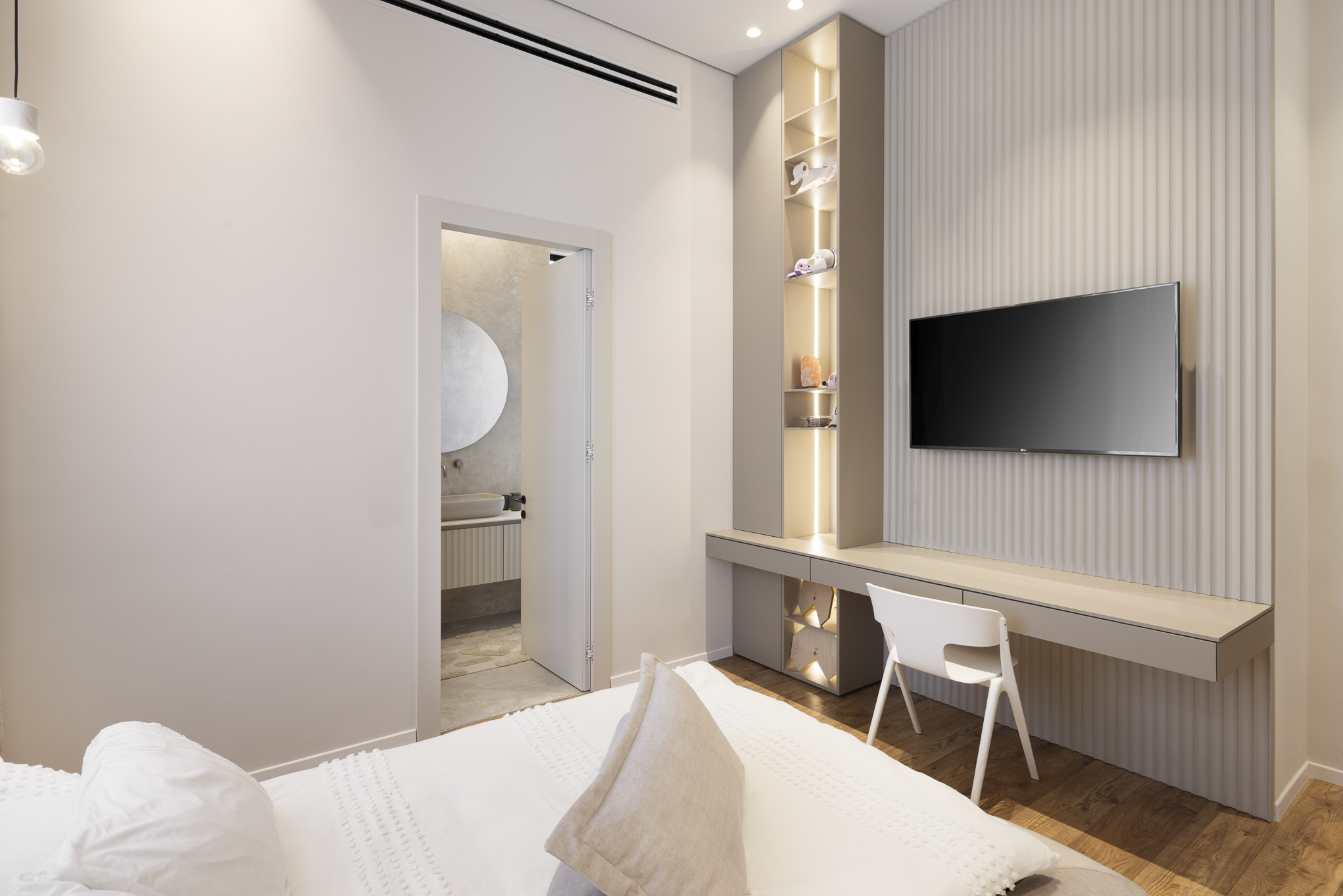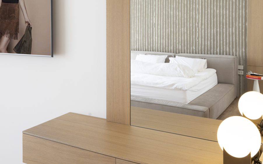 בחדר מאסטר הורים מספר פרטי נגרות העוטפים את החדר ומשדרים תחושת רוגע ואינטימיות , גם שם חוזר העץ על קיר ראש המיטה בשילוב אבן פראית , בפינת האיפור ובחדר הארונות , חדר הארונות בשילוב דלתות אלומיניום וזכוכית שקופה מאפשרים גישה נוחה לביגוד , במרכז אי עם מקום לתכשיטים שעונים וכו…