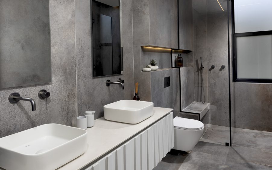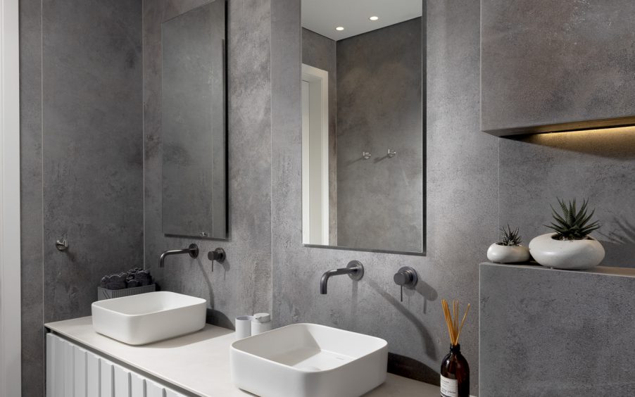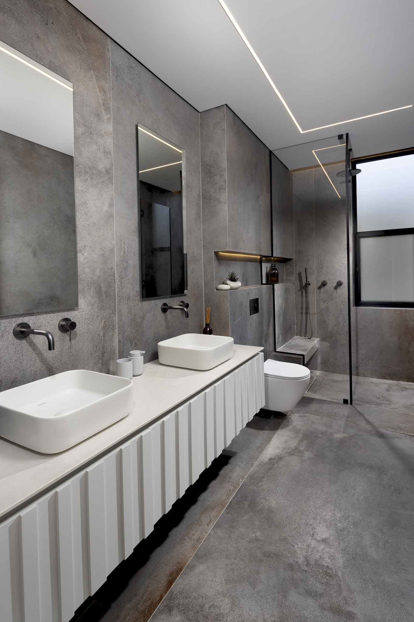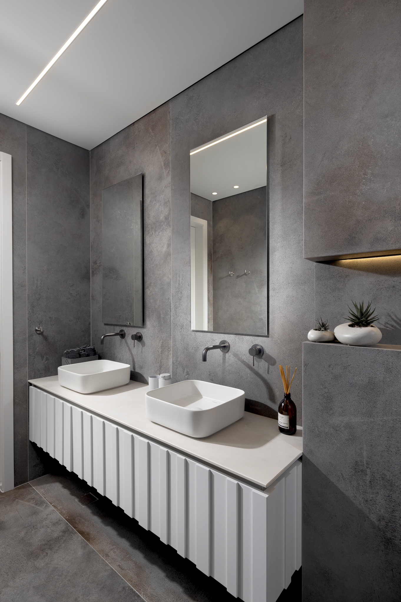 בחדרי הרחצה הארונות קיבלו תשומת לב רבה, חזיתות בחריטה תלת מימדית בגמר צבע עדין ונעים
