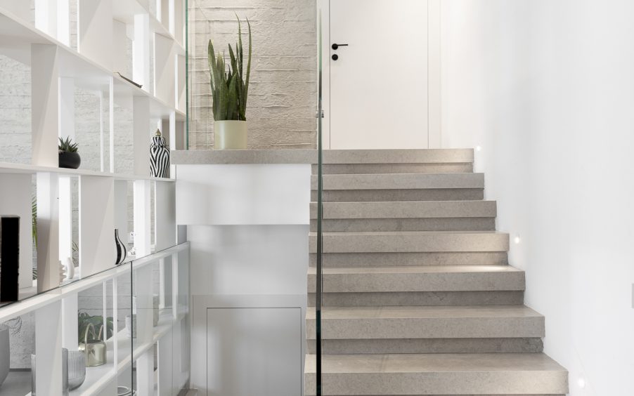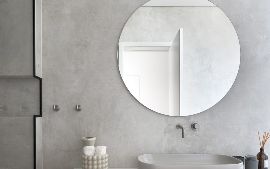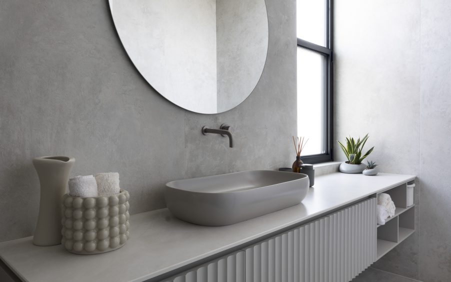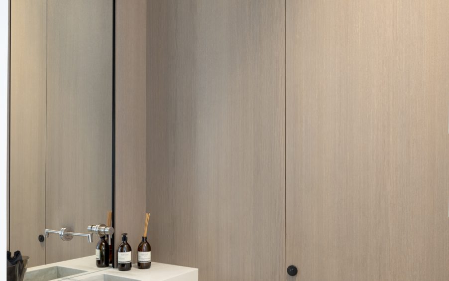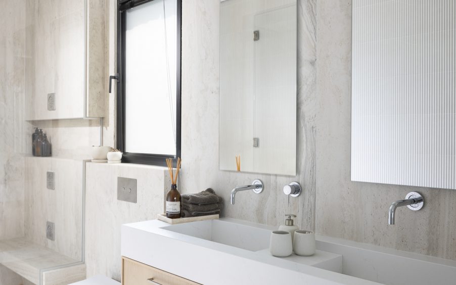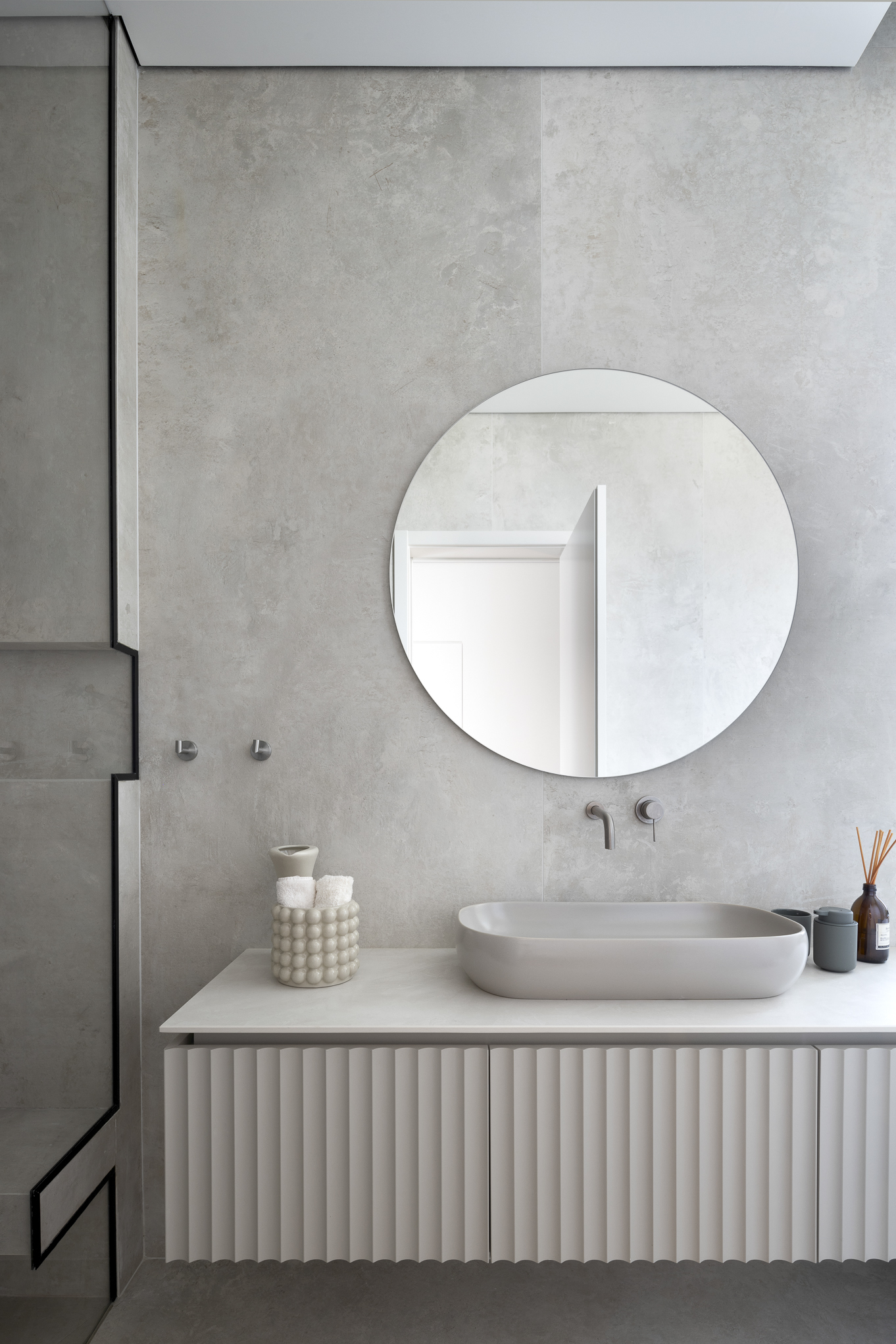 בחדרי הרחצה הארונות קיבלו תשומת לב רבה, חזיתות בחריטה תלת מימדית בגמר צבע עדין ונעים