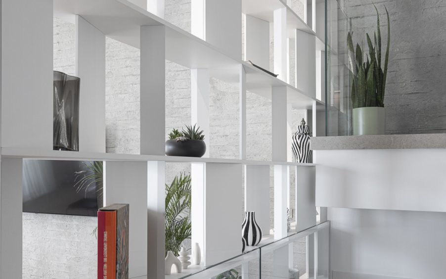 שילוב של ויטרינת זכוכית פינתית המשמשת לפינת בר וכלי אירוח , אי רחב ידיים עליו מונח גוש עץ לישיבה היומיומית.